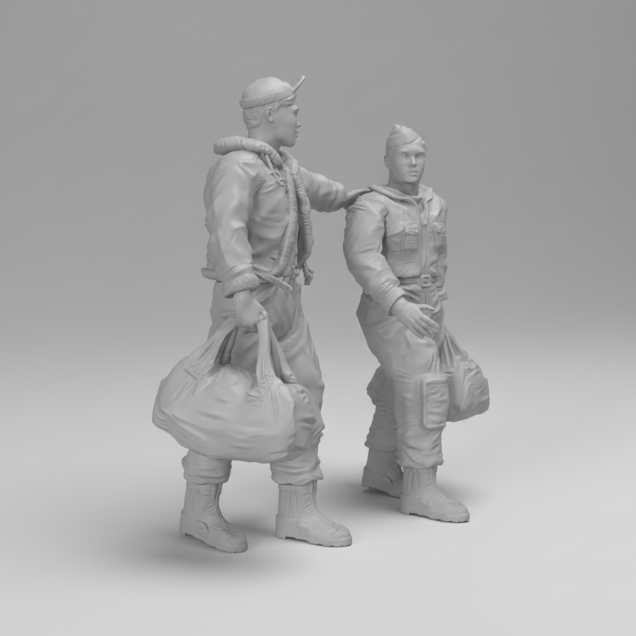 Set de deux membres d’équipage de bombardier portant leur équipement en direction de leur avion. Idéal pour accompagner une scène de terrain ou de décollage.