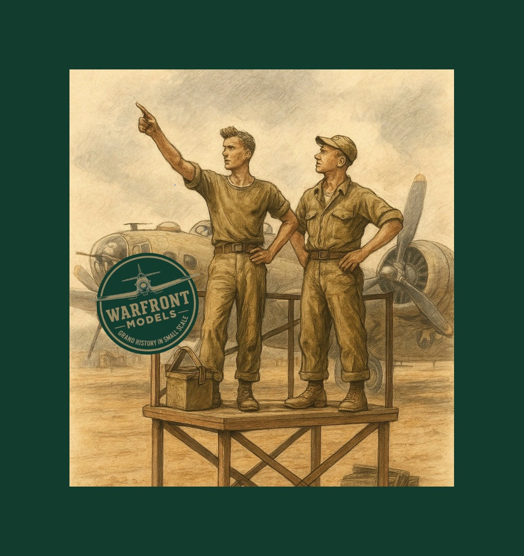 Set de deux mécaniciens de l’USAAF avec échafaudage, idéal pour une scène de maintenance ou de préparation avant mission.